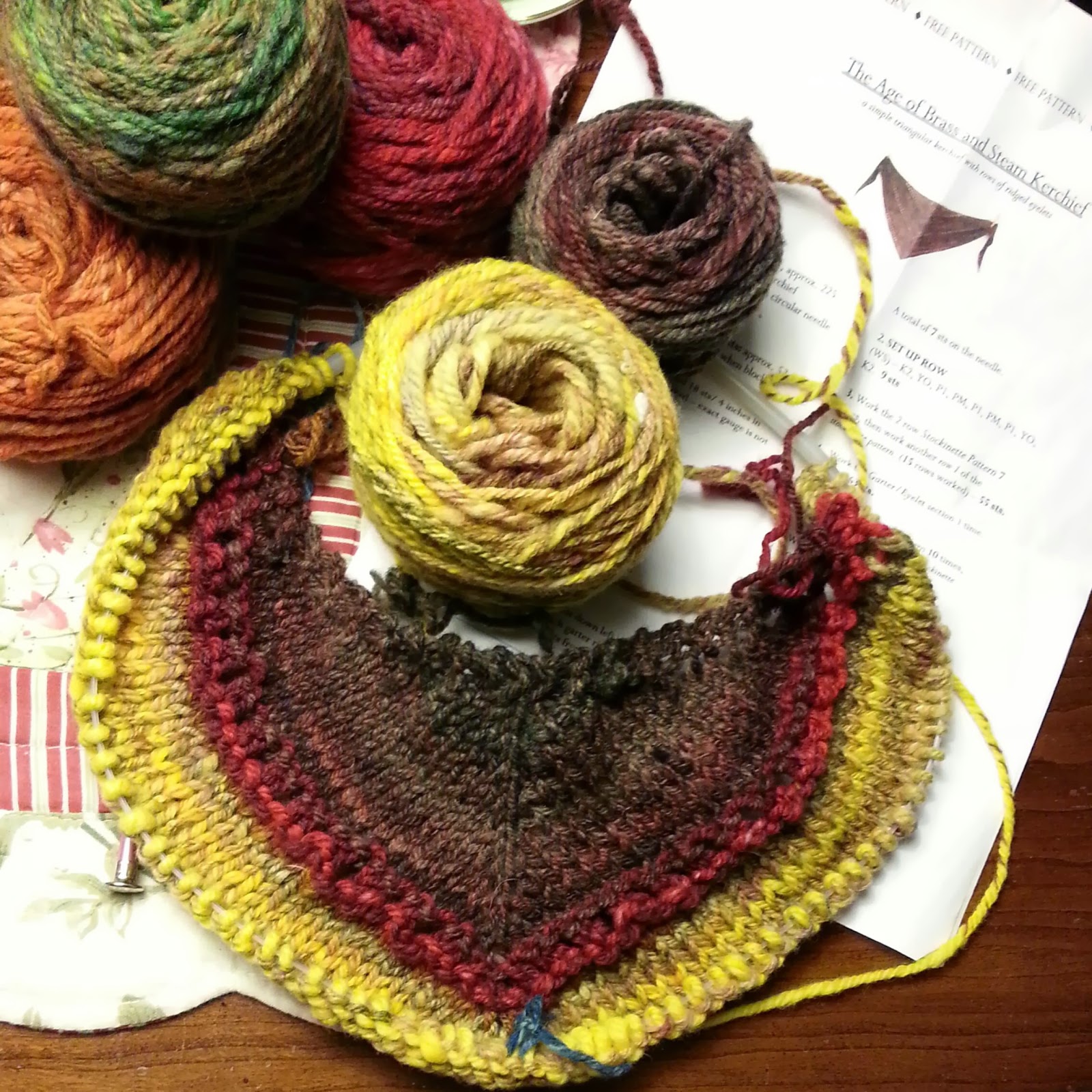 On Instagram recently there was an 'Age of Brass & Steam' Spin-along, Knit-along that I participated in. It actually landed at a timely point in my summer/autumn transition. I wasn't quite in the mood to do Autumn or Christmas knitting but this sal/kal gave me the push to get going. Now I'm excited to begin Christmas projects and I am working on my third shawl since mid-September. But back to the Age of Brass.